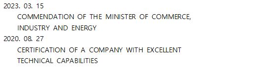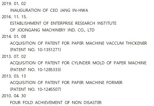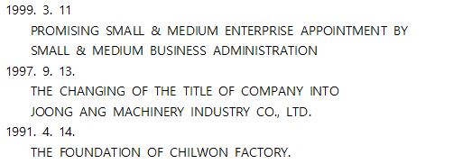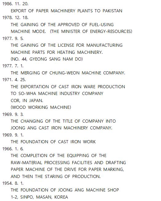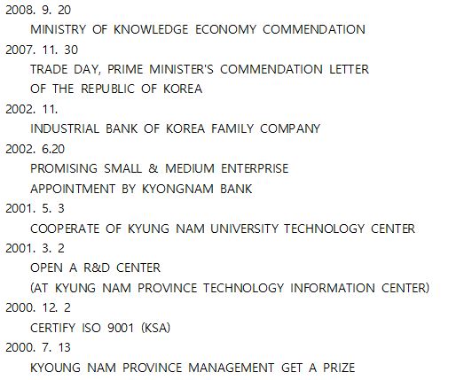 In 1991, we were awarded a National Merit of Industy by Korean Government as a recognition of our fine business performance. It is our desire being continue developing Engineerings and Technicals of the paper Making Machines and Equipments to give the Global customer's satisfaction. We will demomstrate the most advanced engineering performances with never disappointment in coming 21 century to all potential customers in all aspect.